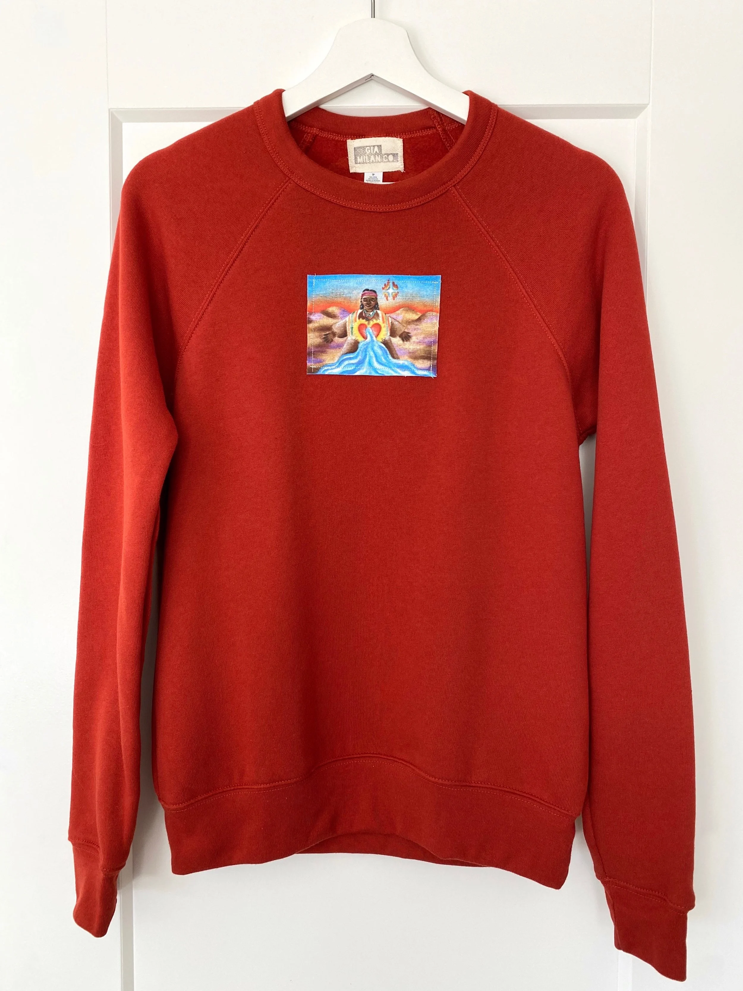 This patch was painted with bright and saturated colors that reflect the landscape of Navajo Territory and the importance of water to the vibrancy of Navajo life. The figure depicted has water spilling out of their glowing heart, demonstrating not only just how crucial water is practically, but also how central it is culturally and as a life force. Additionally, I spent a lot of time researching Navajo folklore which I thought was so unique and captivating, and I wanted to include one element of that in the patch. You can find “Náhookis Biko’ii,” or the flaming northern star, in the top right corner of the piece. I like that it represents being able to find one’s way and how that connects to the restorative mission of the Navajo Water Project.